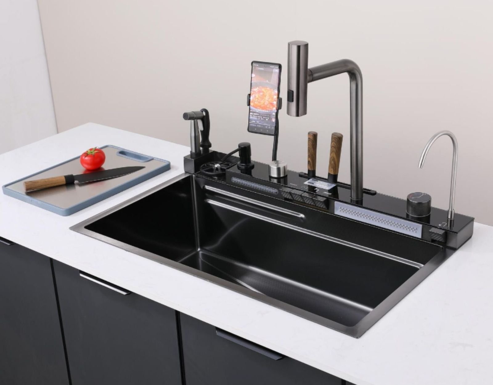 El Lavaplatos de Lujo 75×46 cm incorpora tecnología y accesorios inteligentes que facilitan el lavado, escurrido, preparación de alimentos e incluso el entretenimiento mientras cocinas.